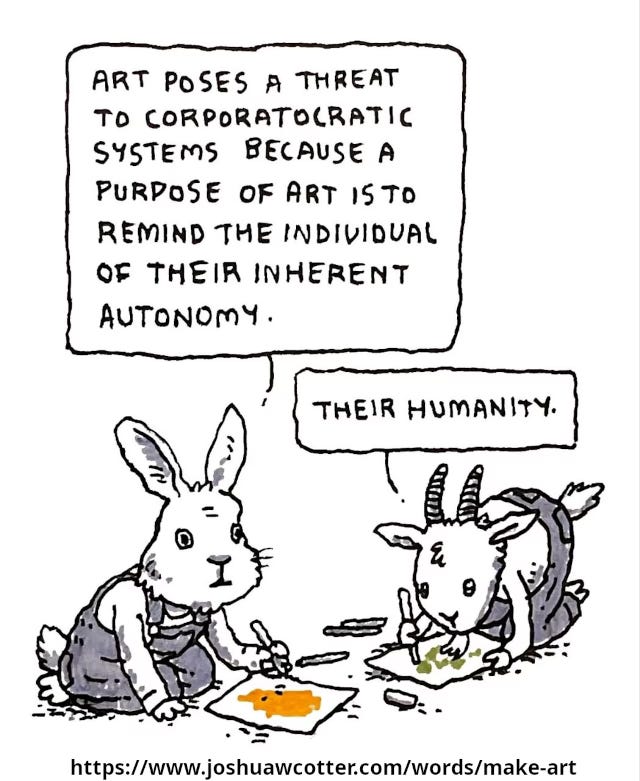 The point is that a better future requires people willing to put care into things, not for the sake of financial gain, but because it is the right thing to do. That can only come when we recognize our own humanity and work to express it on any level we can. It isn’t something that can be done alone. It starts with you but it’s not about you. A pro-human future needs actual humans, and villages need villagers. The system profits of imposed isolation because the void in our hearts it creates will never be filled by consuming. This cycle can be broken, and it requires us to be willing to be there for others. Slop isn’t the enemy, but rather our own indifference is.